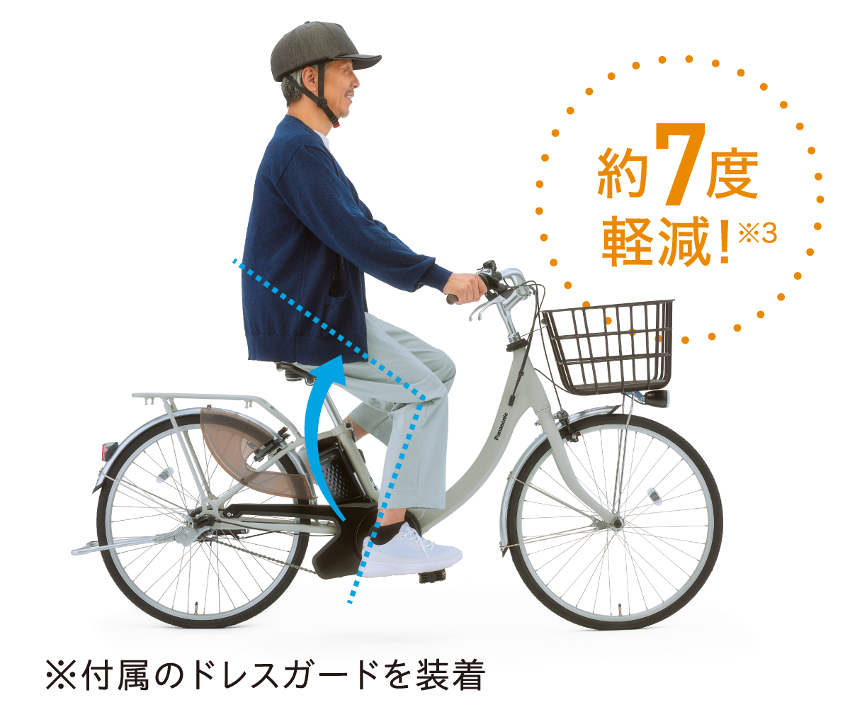 一般的な電動アシスト自転車に比べサドルの高さが約4cmも低く、足をつきやすいので乗り降りの時や、停車時も安心です。