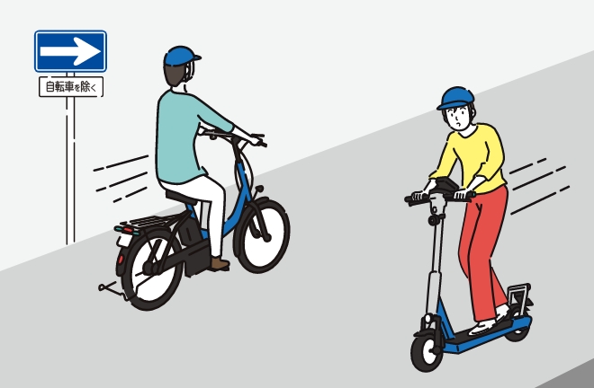 「自転車を除く」という補助標識がある場合は、双方向に通行できます。進行方向の車道の左端に寄って通行しましょう。