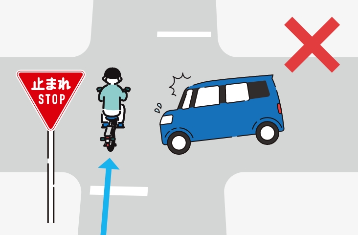 信号がない交差点での出合頭事故の多くは、一時停止をせず、安全確認を怠って交差点に進入したことが原因となっています。