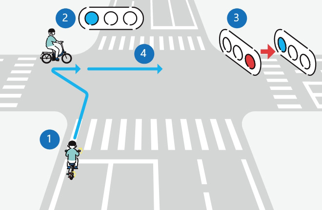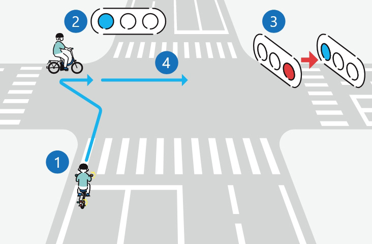 交差点手前で右側の方向指示器で合図を出し、青信号で交差点の向こう側まで直進